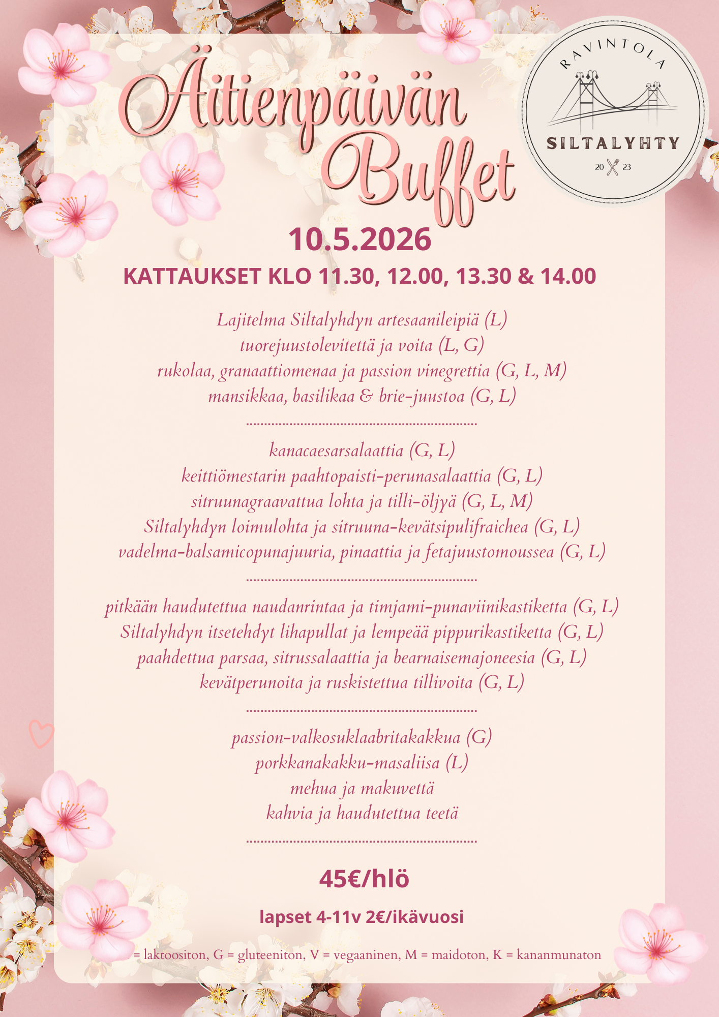 Äitienpäivän buffet Ravintola Siltalyhdyssä 10.5.2026.
